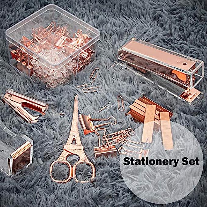 Gutyble Rosegold Office Supplies Set,Package Contains Stapler,Tape Dispenser,Staple Remover,Scissors,Binder Clips,Paper Clips,Push Pins and 1000pcs Staples.Acrylic Office Desk Accessories Kits