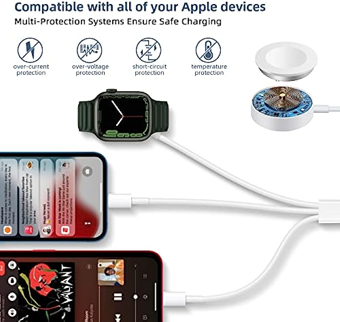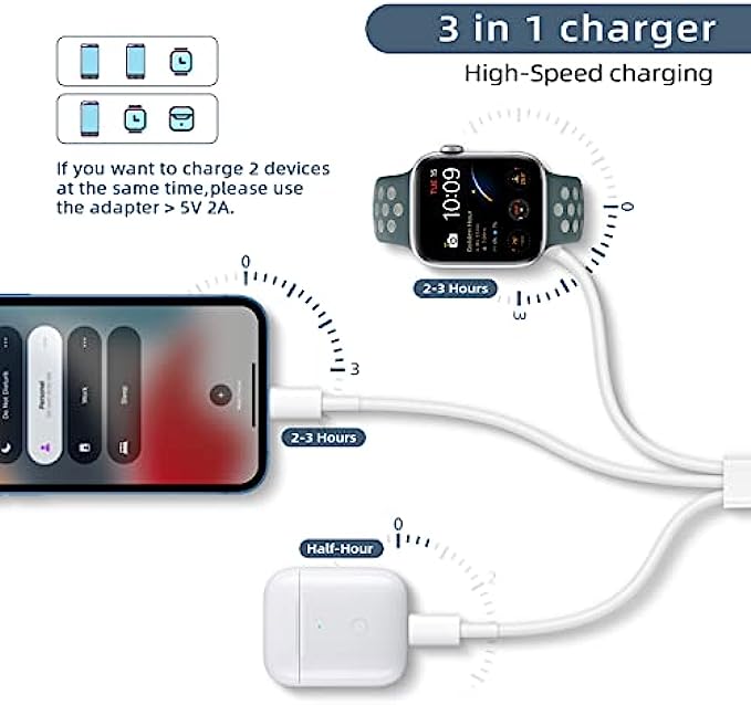 • Universal Compatibility: The 3 in 1 apple watch and phone charging cable is Compatible with all iWatch Series 7/6/5/4/3/2/1/SE and iPhone /iPad/Airpods Series.