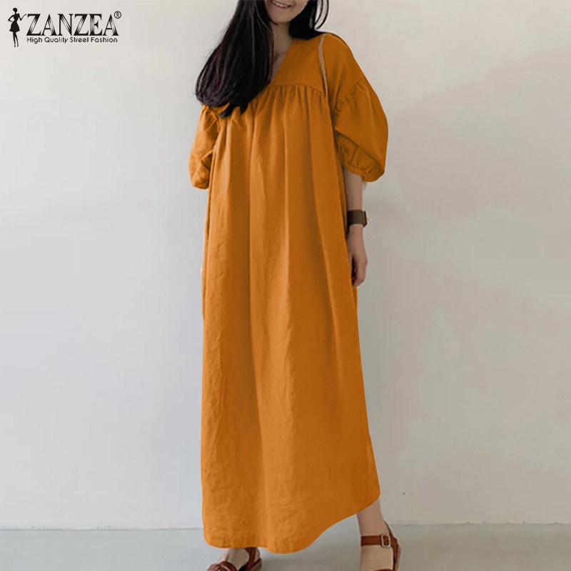 ZANZEA Women Fashion Elegant Solid V-Neck Three Quarter Luxurious Puff Sleeve Side Pockets Casual Dresses